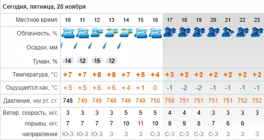Вечером похолодает до +3 градусов, облака не разойдутся. Ветер ожидается умеренный, порывы достигнут 10 метров в секунду. Такая погода продержится весь день 28 ноября.