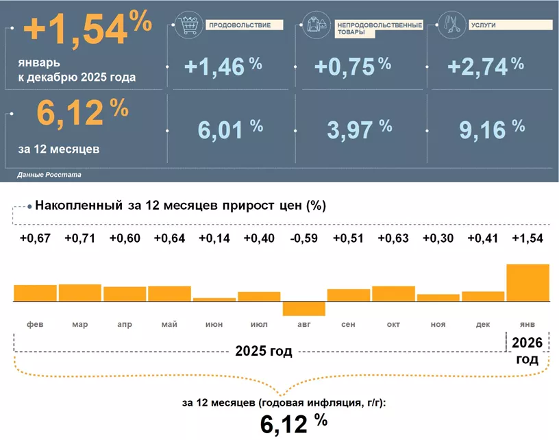 По данным Росстата, в январе 2026 года жители Липецкой области столкнулись с ростом цен на 1,54% по сравнению с декабрем. Годовой показатель инфляции достиг 6,12%, что превышает средний уровень по стране.
